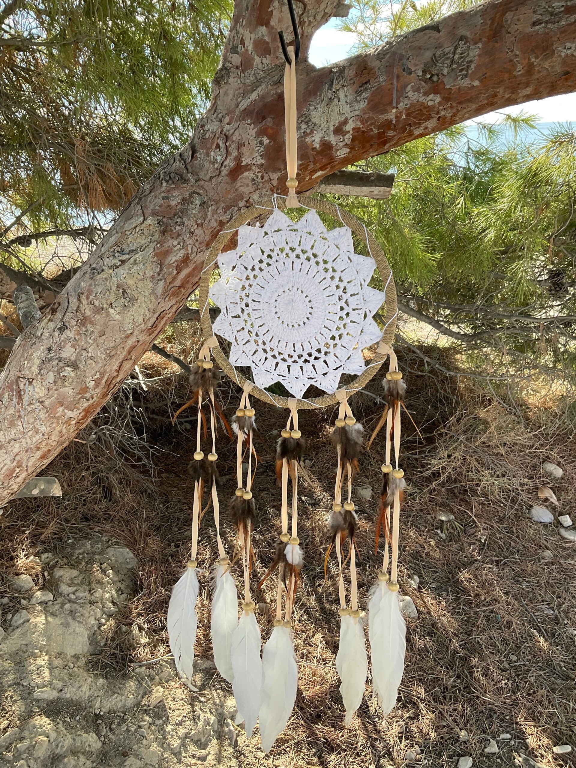 Prachtige dromenvanger gehaakt met veren.