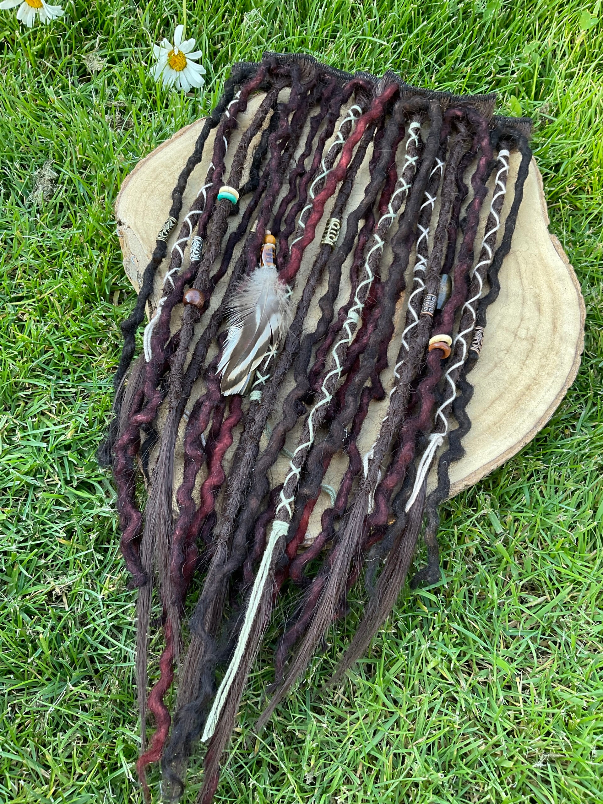 Bestaat uit: combinatie van synthetisch haar en wol. De woldreads zijn met de hand geverft met echte planten.