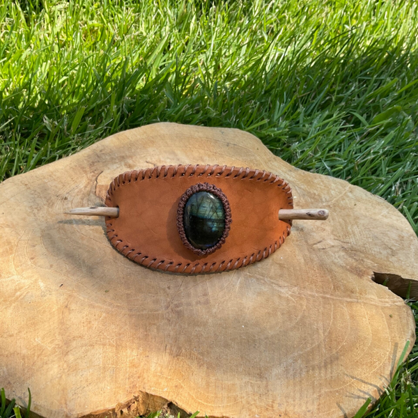 De haarclip is gemaakt van leer met een macrame omhulde labradoriet edelsteen.