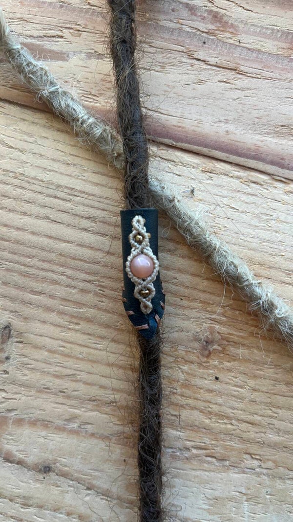 Deze leren dread kraal is een mooie toevoeging voor natuurlijke en synthetische dreads. De kraal is gemaakt van echt leer met macrame en een maansteentje.